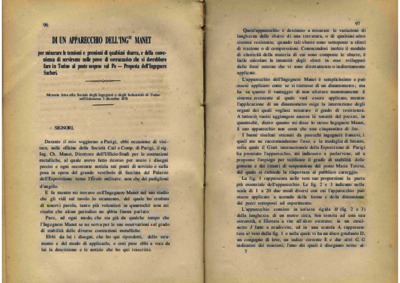 • Di un apparecchio dell'Ing. Manet per misurare le tensioni e pressioni di qualsiasi sbarra e sulla convenienza di servirsene nelle prove di sovraccarico che si dovrebbero fare in Torino al ponte sospeso sul Po - Proposta dell'Ing. Sacheri - Con una tavola / G. Sacheri pagg: 96-101