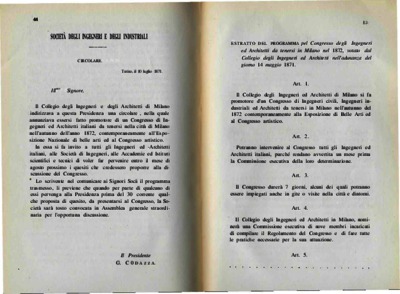 Circolare 10 luglio 1871, relativa al Congresso degli Ingegneri e degli Architetti Italiani da tenersi in Milano nell'autunno 1872