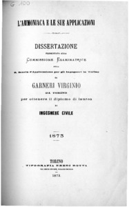L' ammoniaca e le sue applicazioni: dissertazione presentata alla commissione esaminatrice della r. Scuola d' applicazione per gli ingegneri in Torino da Garneri Virginio da Torino per ottenere il diploma di laurea di ingegnere civile
